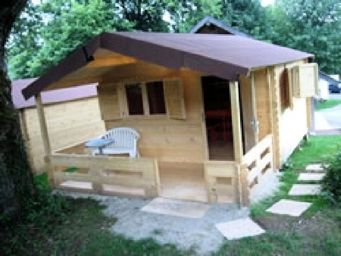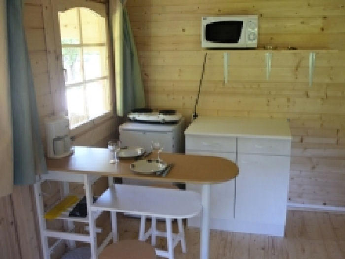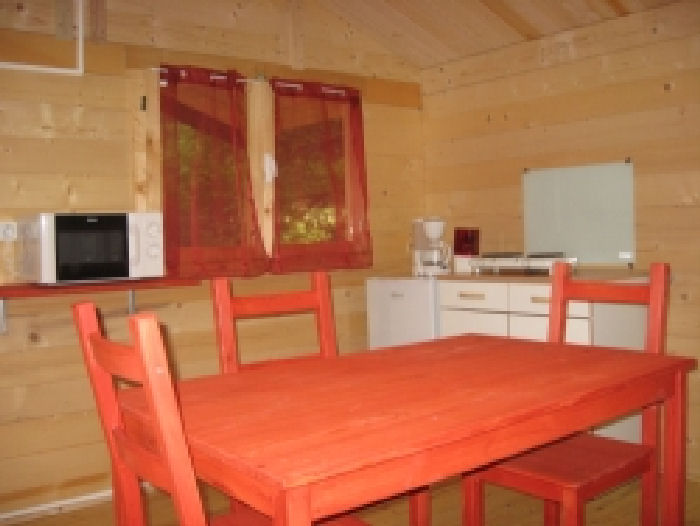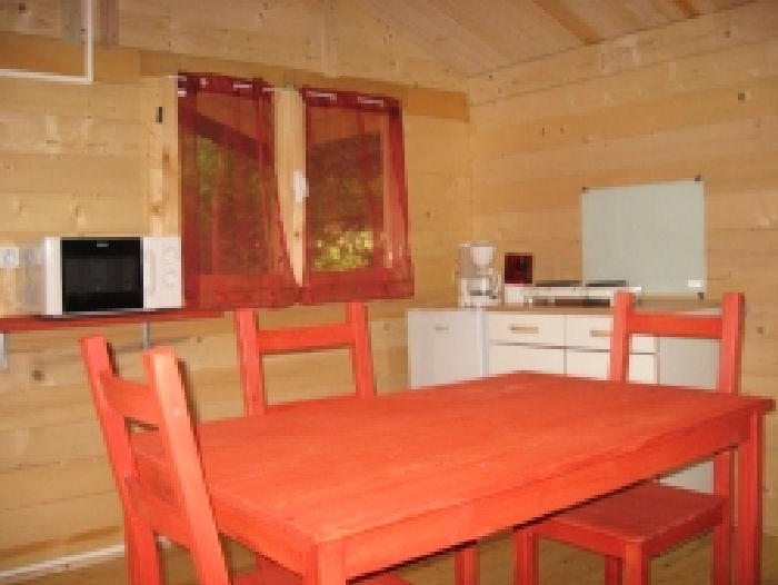 Chalet de 16m² pour 2 personnes, composé d'une kitchenette équipée, d'un séjour avec un coin repas et un canapé convertible, et d'une terrasse. A noter : le chalet ne possède pas d'arrivée d'eau (pas d'évier ni sanitaires). Le bloc sanitaires du camping se situe à 2 pas du chalet.