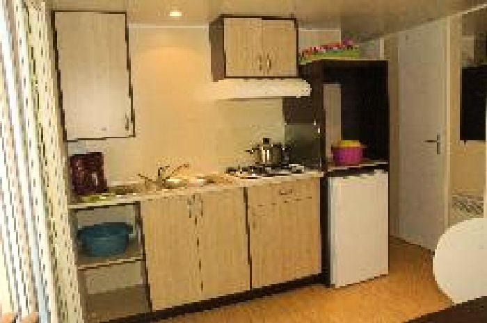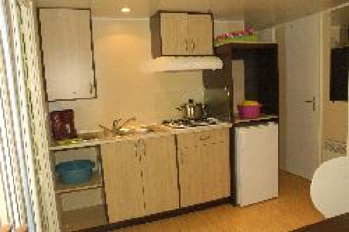 Mobil Home constitué d'un coin cuisine équipé de plaques de cuisson, réfrigérateur, micro onde, cafetière électrique, micro-ondes et vaisselle. Oreillers et couvertures fournis. Terrasse avec salon de jardin, parasol et bains de soleil.