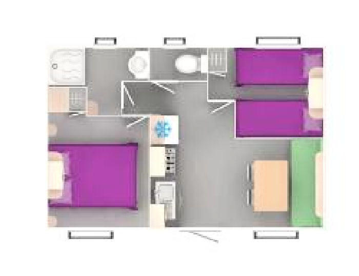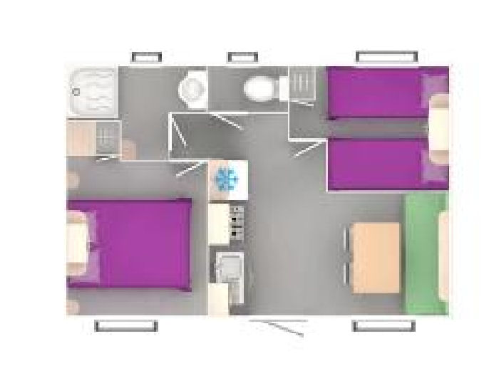 Mobil home de 31m² pour 6 personnes, composé d'une kitchenette équipée, d'un séjour avec un coin repas, d'une chambre avec un lit double, d'une chambre avec 2 lits simples, d'une chambre avec 2 lits superposés, d'une salle de bains avec une douche, d'un WC séparé et d'une terrasse semi-couverte. Mobil home neuf.