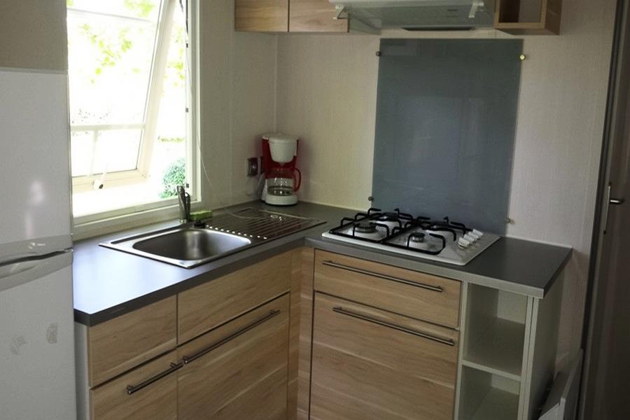 Le mobil home est équipé d'une plaque de cuisson 4 feux, d'un réfrigérateur, d'une cafetière et de tous les ustensiles de cuisine.
