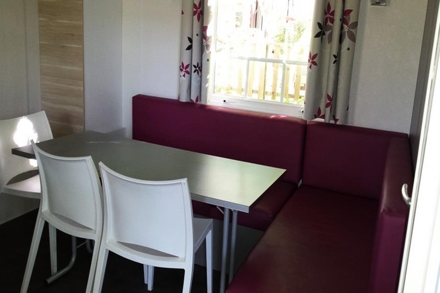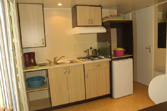 Mobil Home de 28m² pour 4/6 personnes, composé d'une kitchenette équipée, d'un séjour avec un coin repas et une banquette convertible en couchage pour 2 personnes, d'une chambre avec un lit double, d'une chambre avec 2 lits simples, d'une salle de bains avec une douche, d'un WC séparé et d'une terrasse.