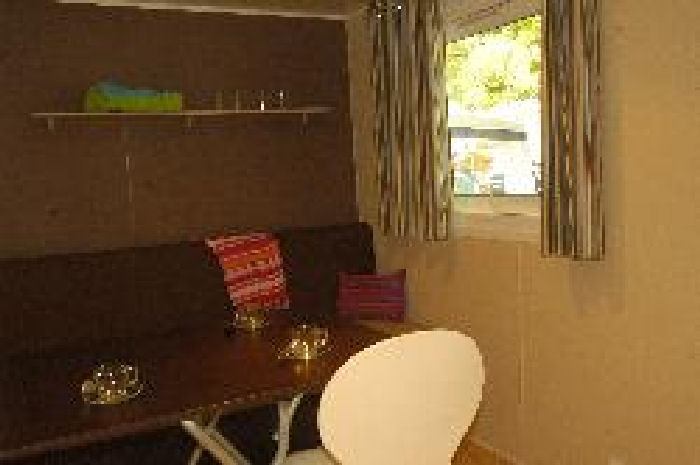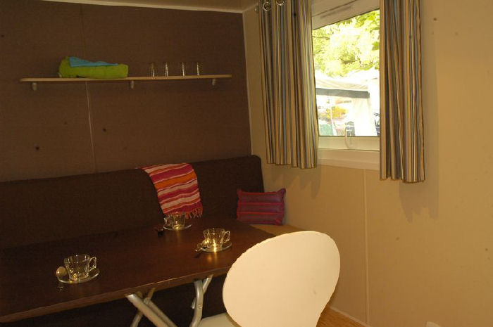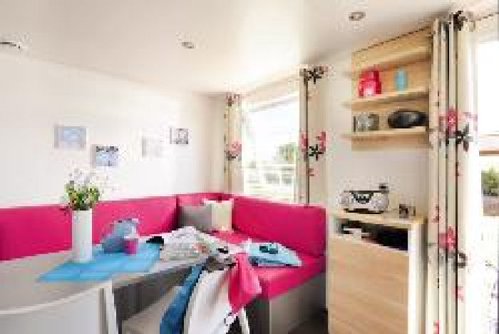 Mobil home de 18m² environ pour 2/4 personnes, composé d'une kitchenette équipée, d'un séjour avec un coin repas et une banquette convertible en couchage pour 2 personnes, d'une chambre avec un lit double, d'une salle de bains avec une douche et d'un WC séparé.Mobil home neuf.