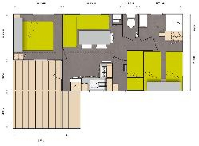 Mobil home de 31m² pour 6 personnes, composé d'une kitchenette équipée, d'un séjour avec un coin repas, d'une chambre avec un lit double, d'une chambre avec 2 lits simples, d'une chambre avec 2 lits superposés, d'une salle de bains avec une douche, d'un WC séparé et d'une terrasse semi-couverte.Mobil home neuf.