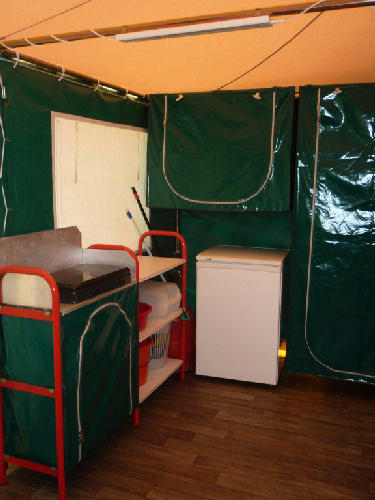 Le bungalow toilé est équipé d'un réchaud, d'un réfrigérateur et de tous les ustensiles de cuisine.