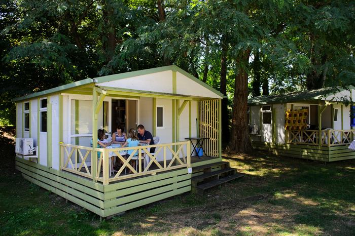 Chalet climatisé de 39m² pour 6 personnes, composé d'une kitchenette équipée, d'un séjour avec un coin repas, de 2 chambres avec un lit double chacune, d'une chambre avec 2 lits superposés, d'une salle de bains avec une douche et un WC, et d'une terrasse couverte.