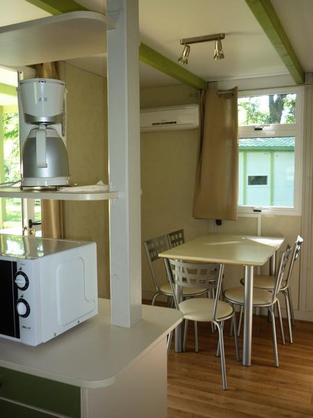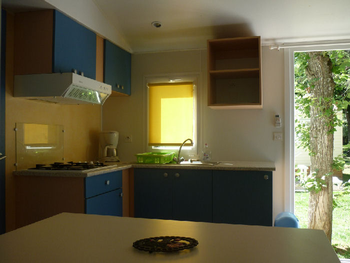 Mobil Home constitué d'un coin cuisine équipé d'une plaque de cuisson (4 feux gaz), d'un réfrigérateur, d'un micro-ondes, ainsi que de l'ensemble des ustensiles de cuisine. Les oreillers et couvertures vous sont fournis. Salon de jardin et étendoir sur la terrasse.