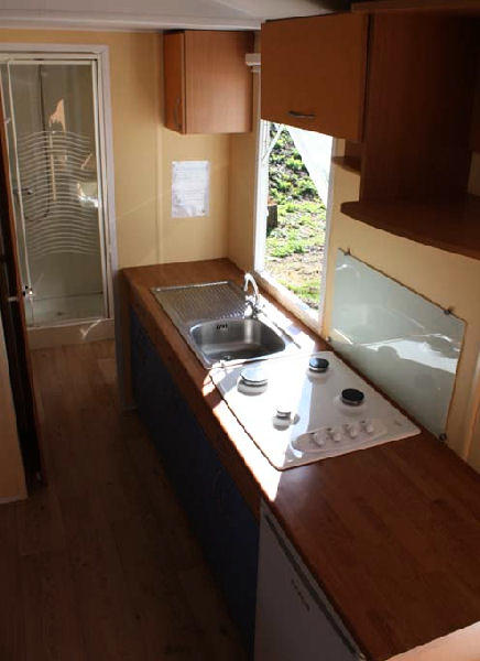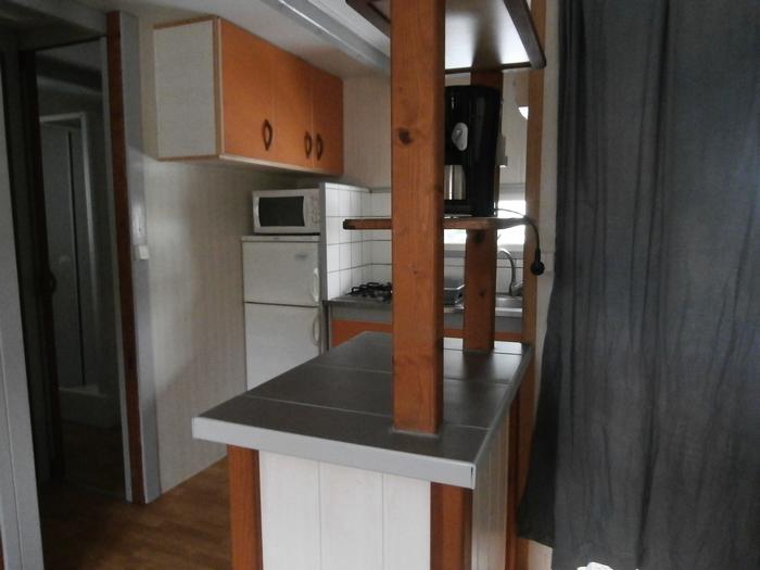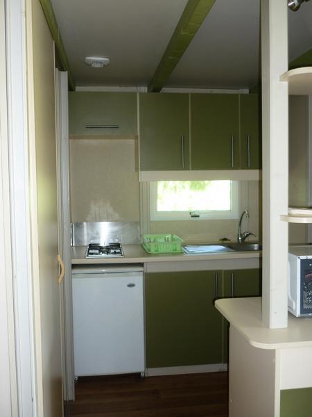 Le mobil home est équipé d'une plaque de cuisson (4 feux gaz), d'un réfrigérateur, d'un micro-ondes et de tous les ustensiles de cuisine.