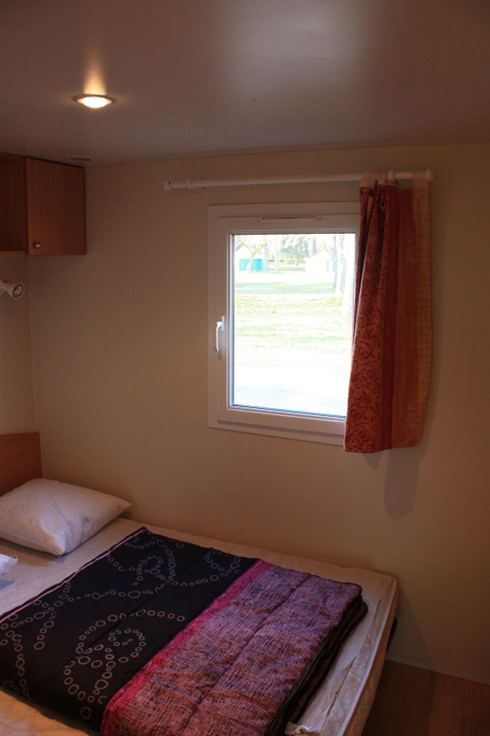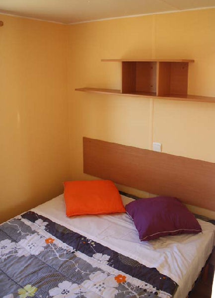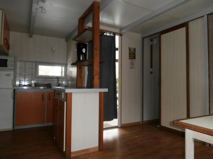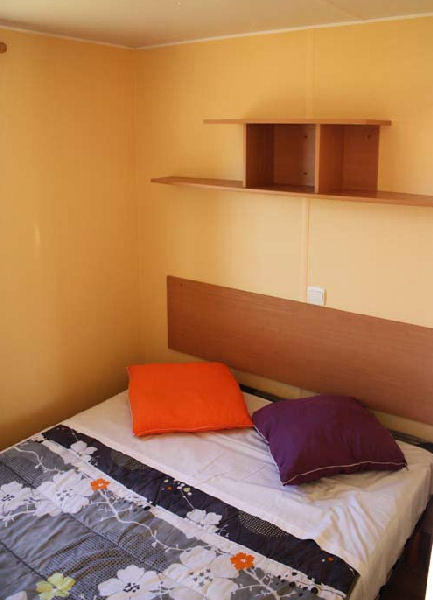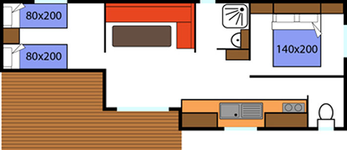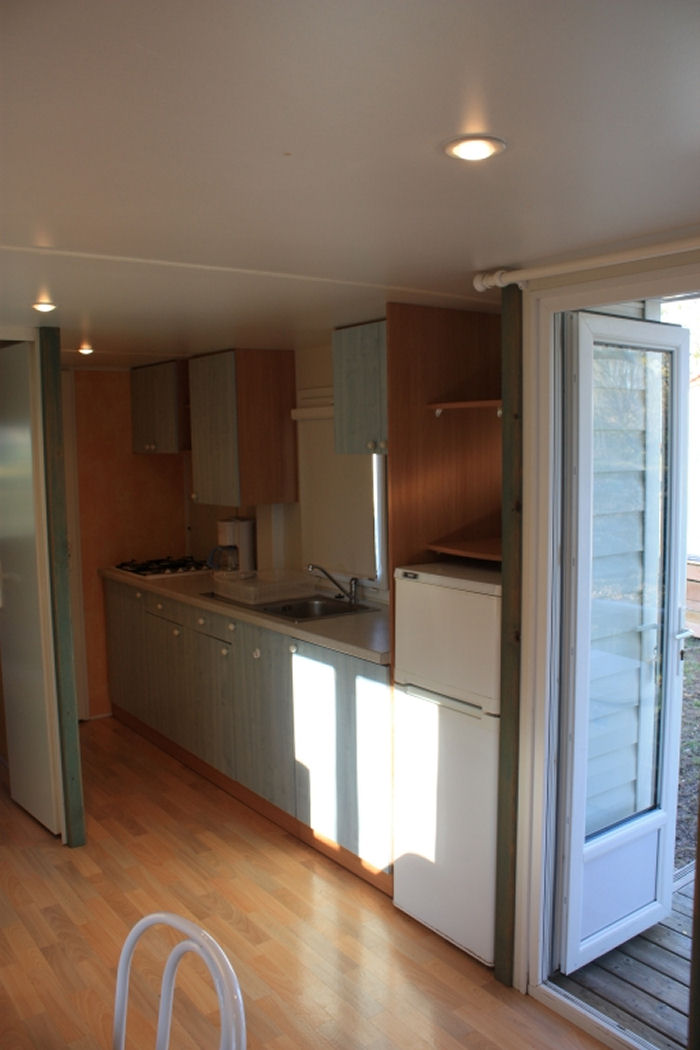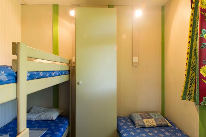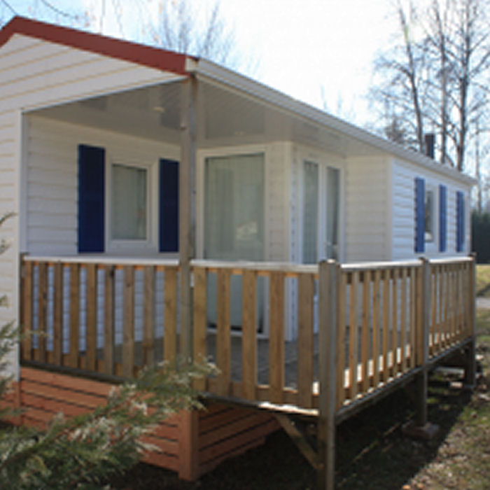 Mobil Home de 24m² pour 5 personnes, composé d'un séjour , d'une chambre avec un lit double, d'une chambre avec deux lits simples et un lit superposé, d'une cuisine équipée, d'une salle de bain avec toilettes et d'une terrasse.