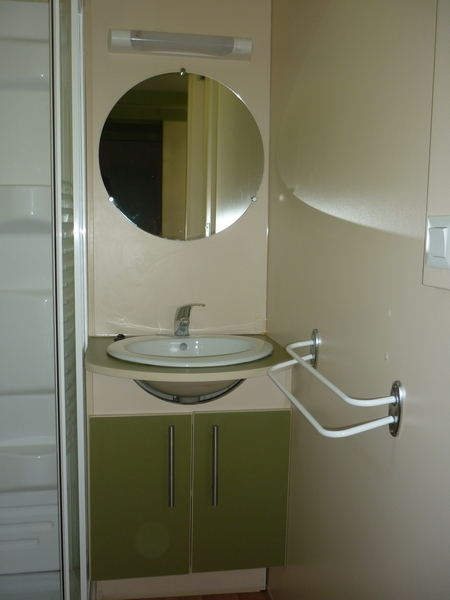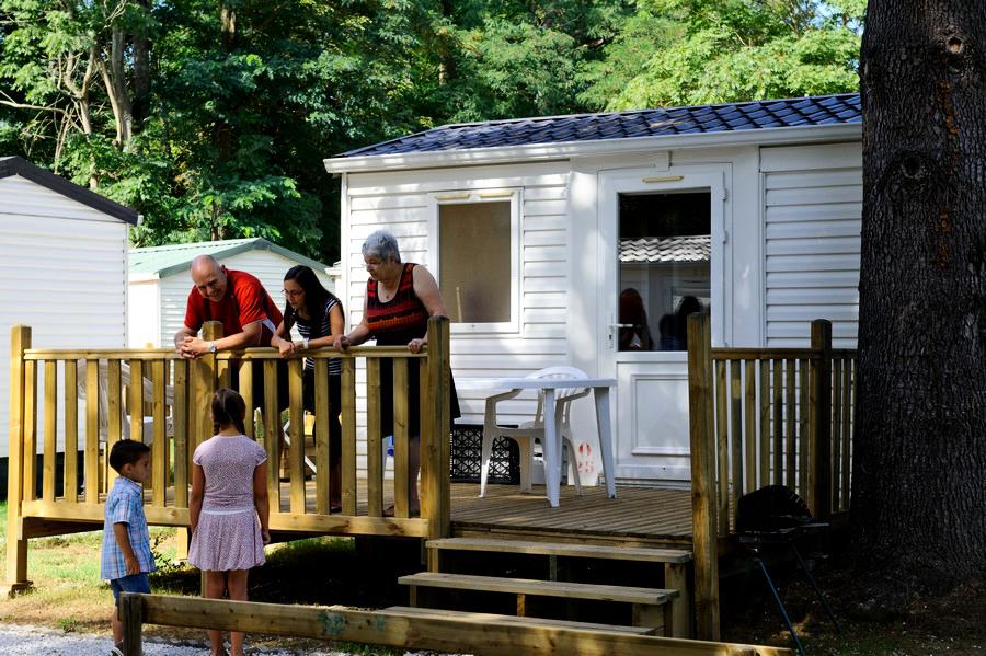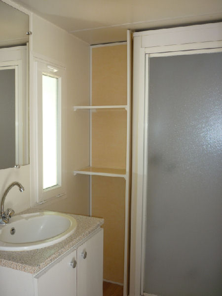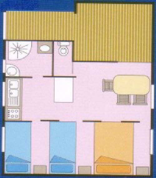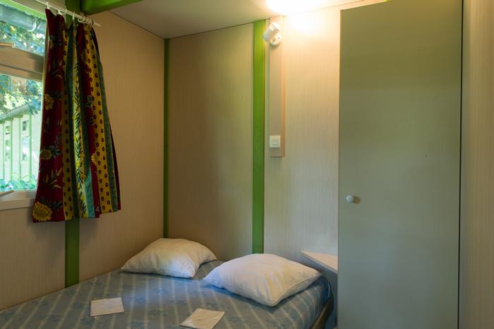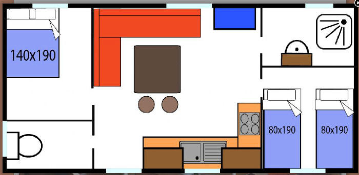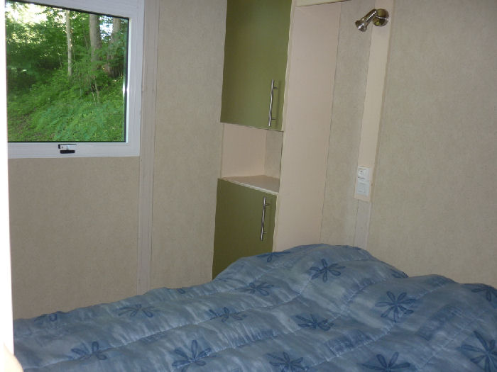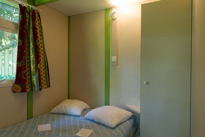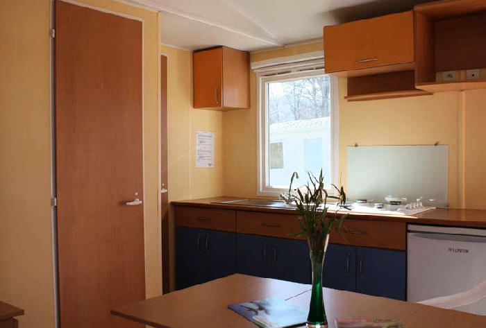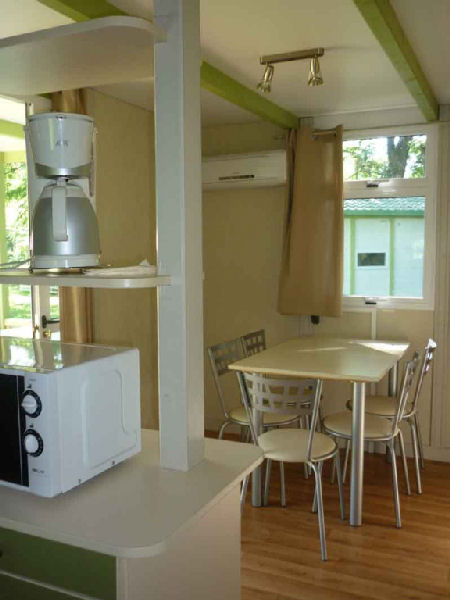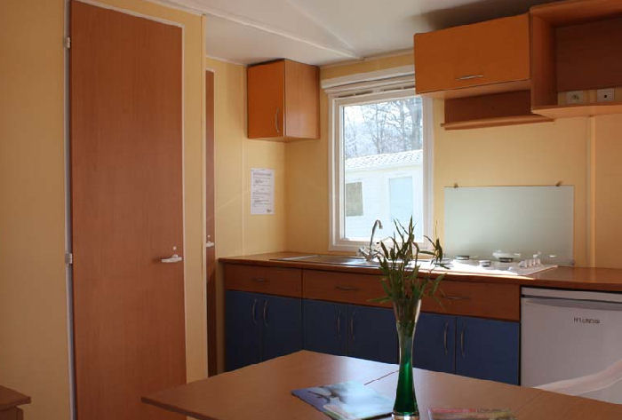 Mobil Home de 24m² pour 5 personnes, composé d'un séjour , d'une chambre avec un lit double, d'une chambre avec deux lits simples et un lit superposé, d'une cuisine équipée, d'une salle de bain avec toilettes et d'une terrasse.