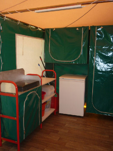 Bungalow toilé constitué d'un coin cuisine équipé d'un réchaud (2 feux gaz), d'un réfrigérateur ainsi que de l'ensemble des ustensiles de cuisine. Les oreillers et couvertures vous sont fournis. Parasol et étendoir sur la terrasse.