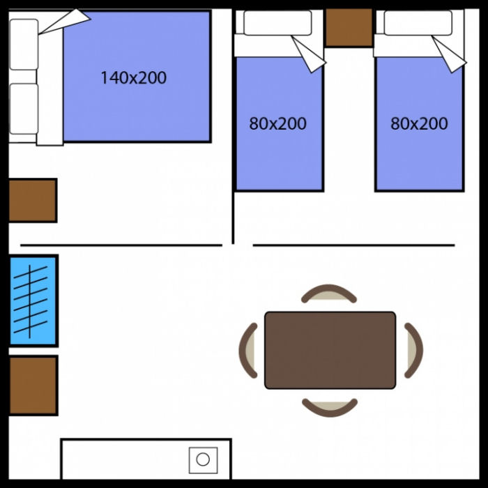 24 m2 de surface 1 Chambre avec 1 Lit double 1 Chambre avec 2 Lits jumeaux et 1 Lit(s) superpos?(s) Coin Cuisine nombre de salles de douche : 1 nombre de WC : 1 Terrasse Plaques gaz Micro-ondes R?frig?rateur Vaisselle et ustensiles de cuisine inclus Salon de jardin