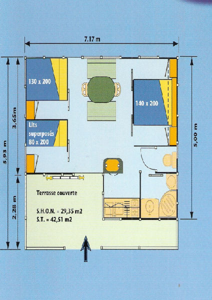 42 m2 de surface 2 Chambres avec 1 Lit double 1 Chambre avec 2 Lit(s) superpos?(s) Coin Cuisine nombre de salles de douche : 1 nombre de WC : 1 Terrasse Plaques gaz Micro-ondes R?frig?rateur Cong?lateur Vaisselle et ustensiles de cuisine inclus Salon de jardin