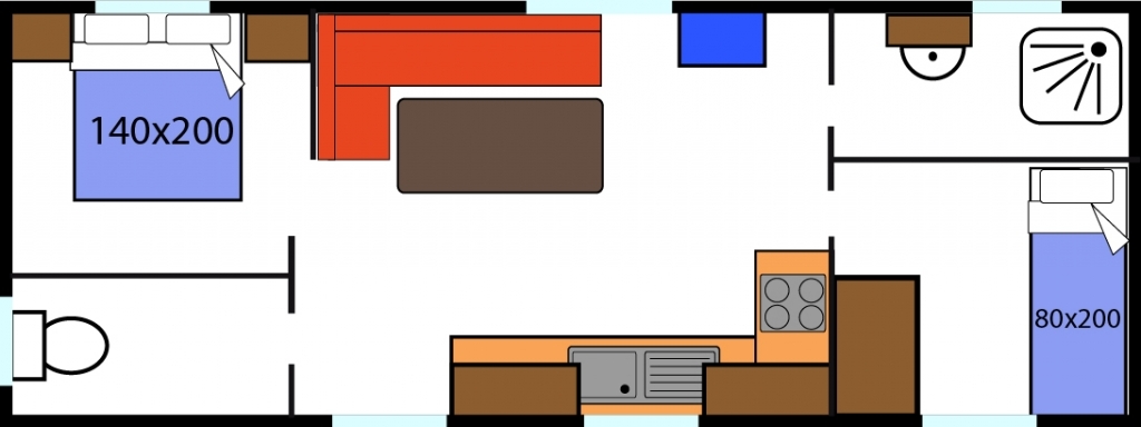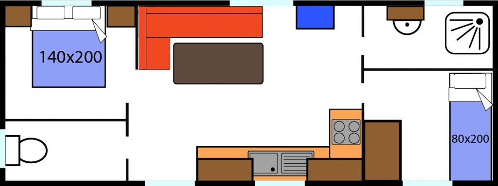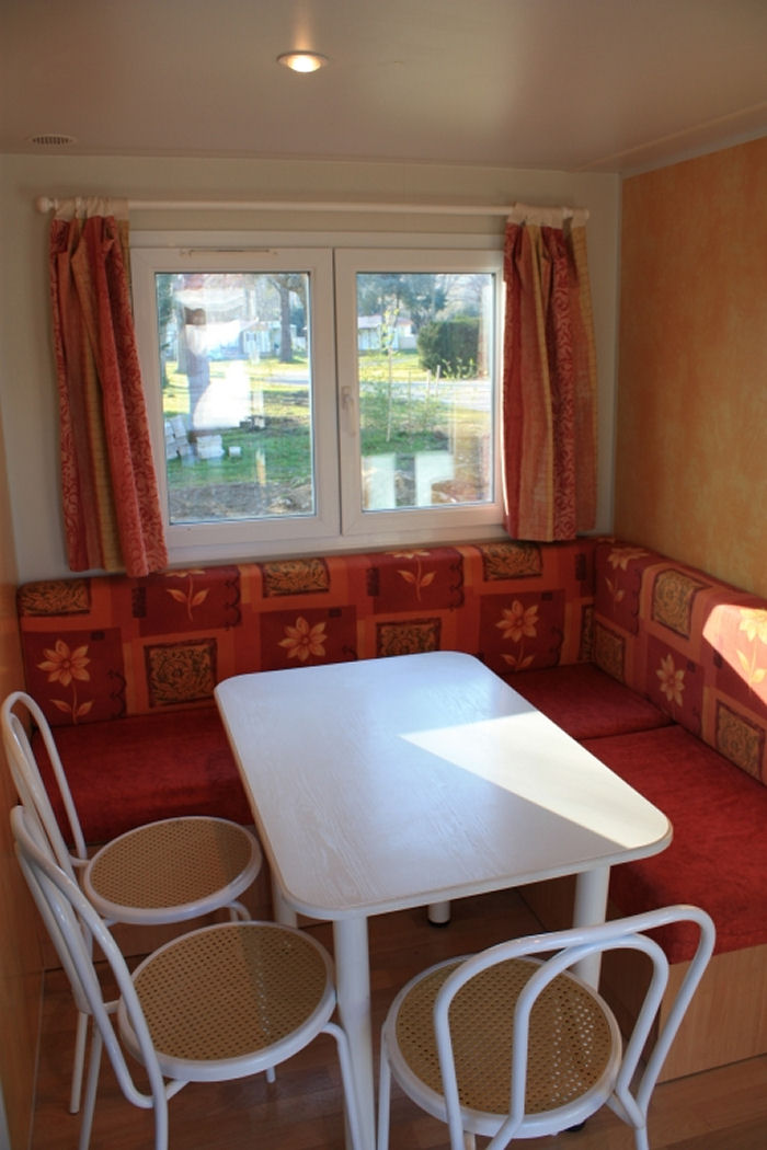 Mobil home de 20m² pour 2 personnes, composé d'une kitchenette équipée, d'un séjour avec un coin repas, d'une chambre avec un lit double, d'une salle de bains avec une douche et un WC.