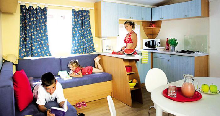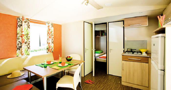 Mobil Home 3 Pièces 4/6 Personnes de 28m² minimum, composé d'un coin cuisine équipé, d'un coin repas avec banquette convertible, d'une chambre avec un lit double, d'une chambre avec 2 lits simples plus 1 lit superposé (ne convient pas aux enfants de moins de 6 ans) ou d'appoint, d'une salle d'eau, de WC séparés ( excepté dans certains hébergements) et d'une terrasse.A noter : dans certains hébergements, il n'y a pas de 3ème lit dans la chambre enfants.
