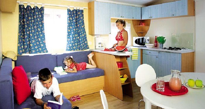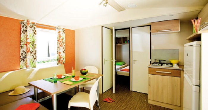 Mobil Home 4 Pièces 6 Personnes de 28m² minimum, composé d'un coin cuisine équipé, d'un coin repas, d'une chambre avec un lit double, d'une chambre avec 2 lits simples, d'une chambre avec 2 lits superposés, d'une salle d'eau, de WC séparés (excepté dans certains hébergements) et d'une terrasse.