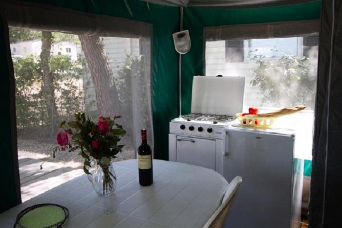 Bungalow Toilé 3 Pièces 4 personnes de 20m², composé d'une chambre avec un lit double, d'une chambre avec 2 lits simples, d'un grand séjour-cuisine équipé et d'une terrasse en bois de 4.40m².A noter: le bungalow n'est pas équipé de sanitaires.