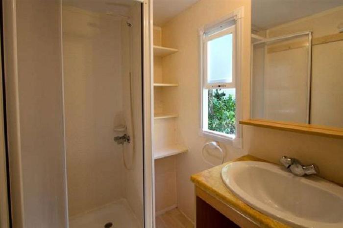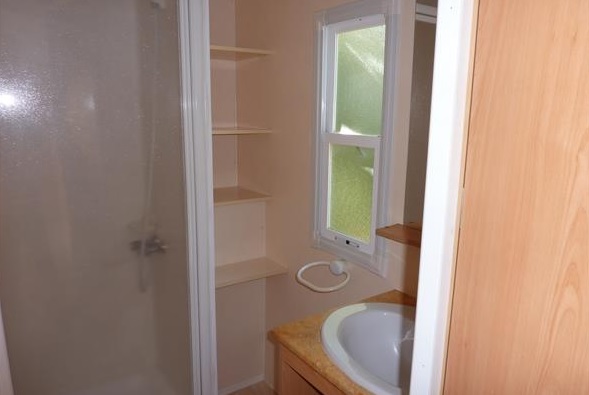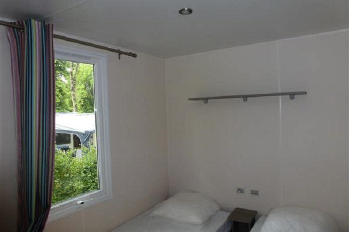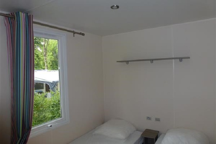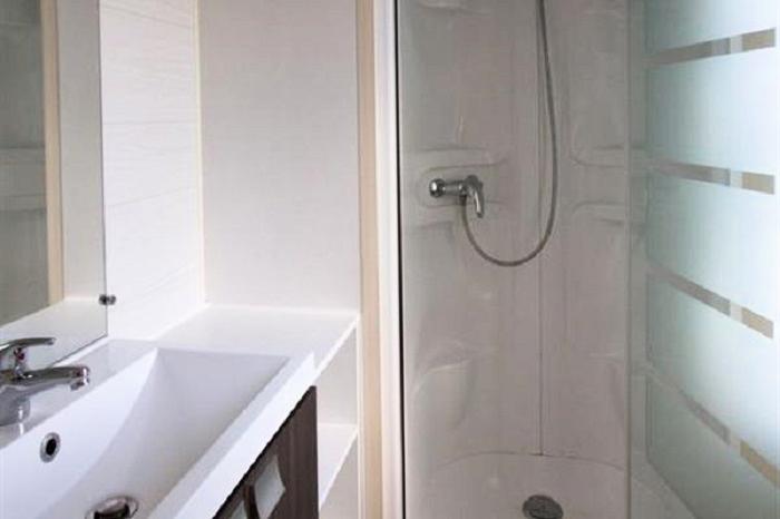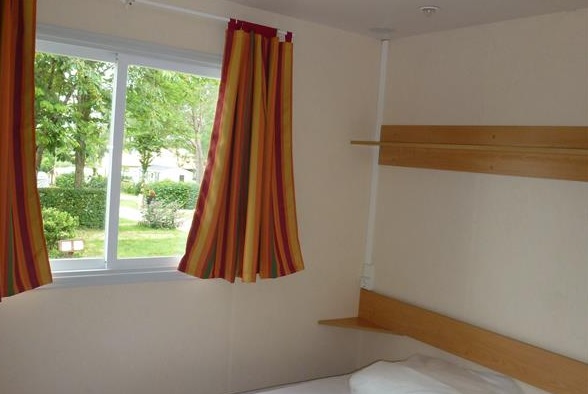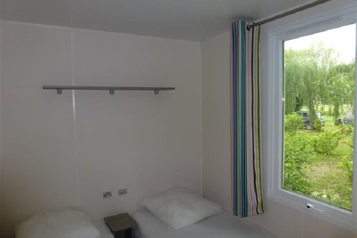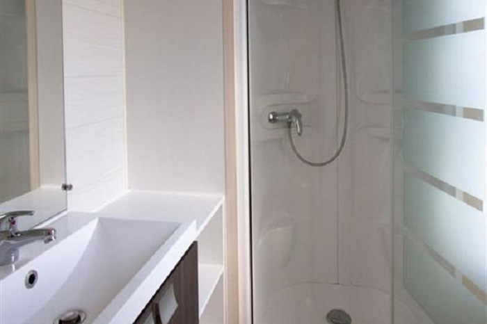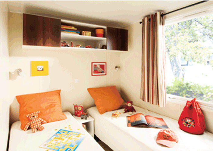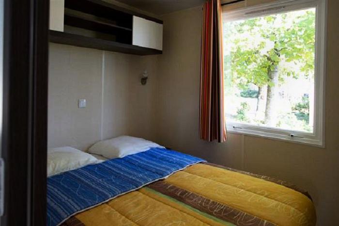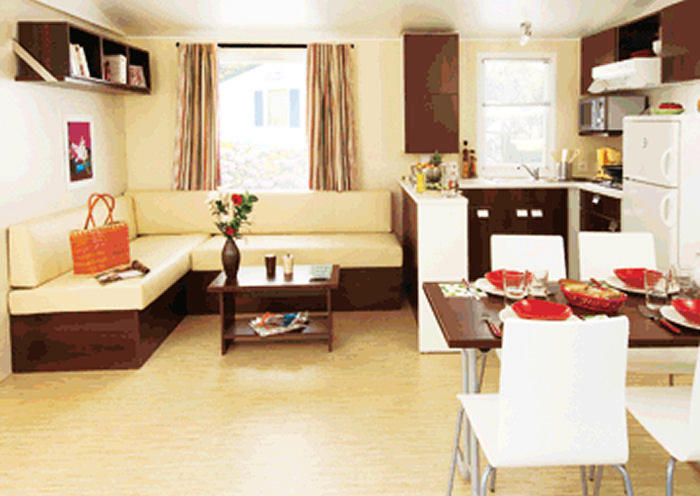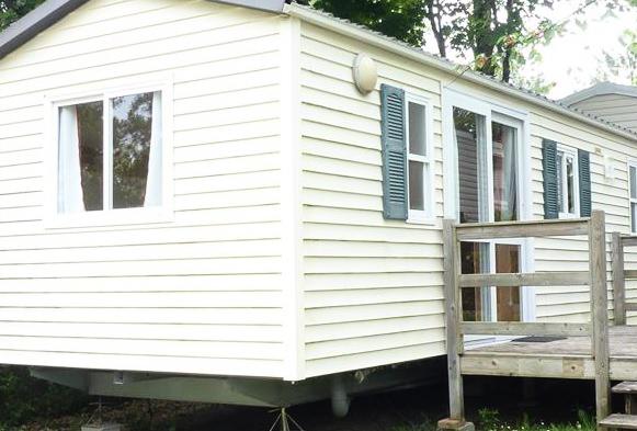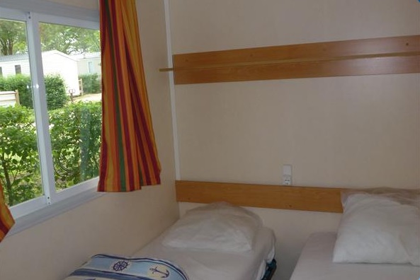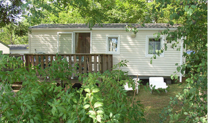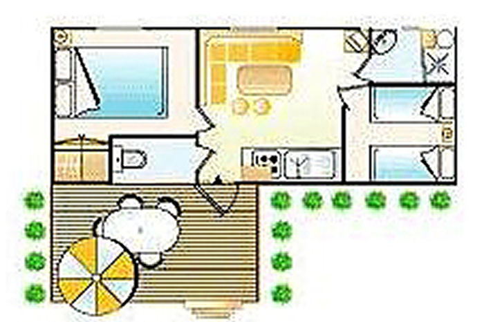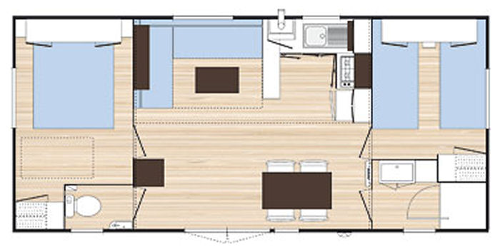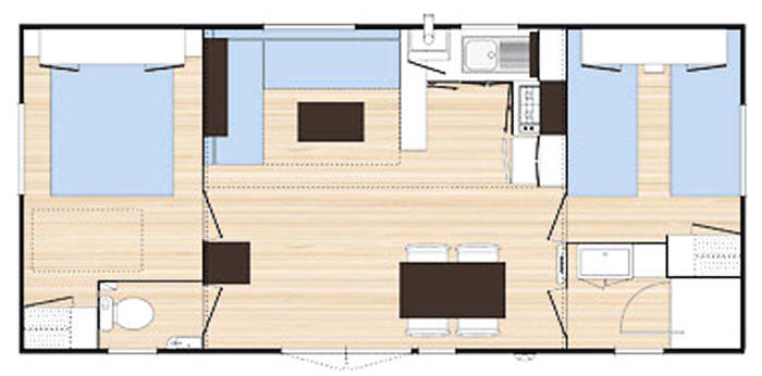 Mobil Home 4 personnes de 27m² composé d'un séjour-salon avec banquette et cuisine équipé, d'une chambre avec un lit double, d'une chambre avec 2 lits simples, d'une salle de bain avec cabine de douche et meuble lavabo, d'un WC indépendant et d'une terrasse en bois de 10m².