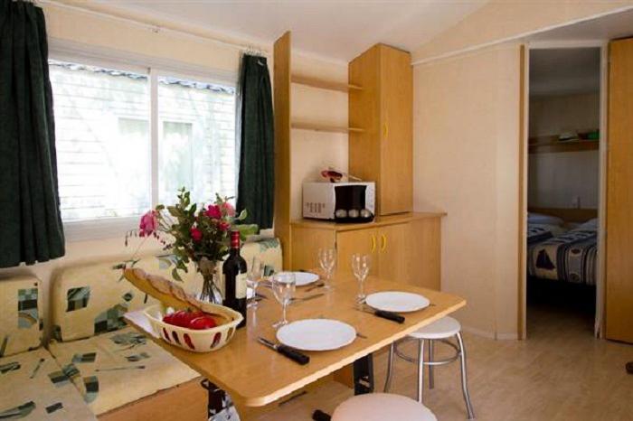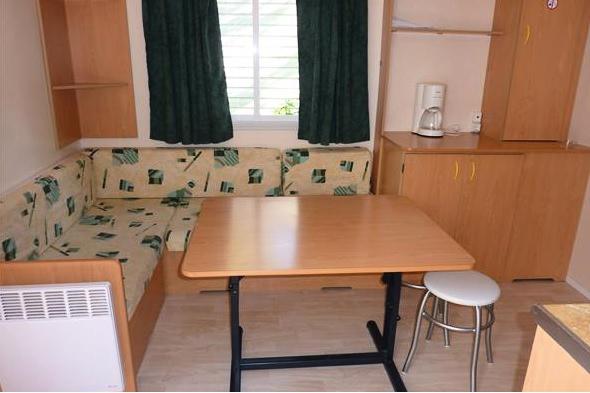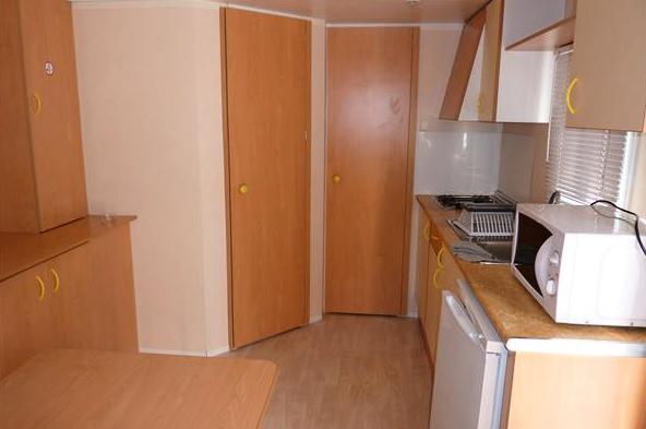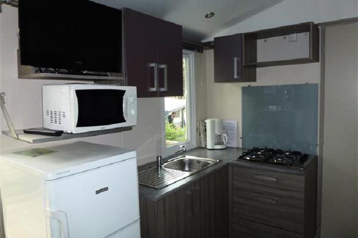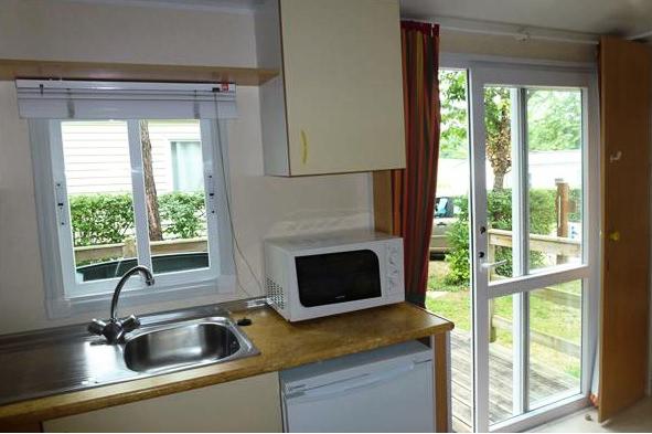 Le mobil home dispose d'un coin cuisine équipé avec réfrigérateur, micro-ondes, plaque de cuisson 4 feux gaz, cafetière électrique et kit vaisselle. Terrasse avec mobilier de jardin et parasol. Chauffage électrique.