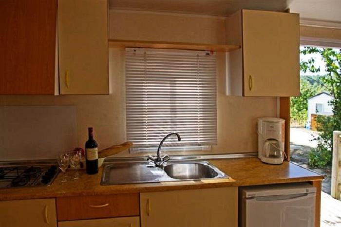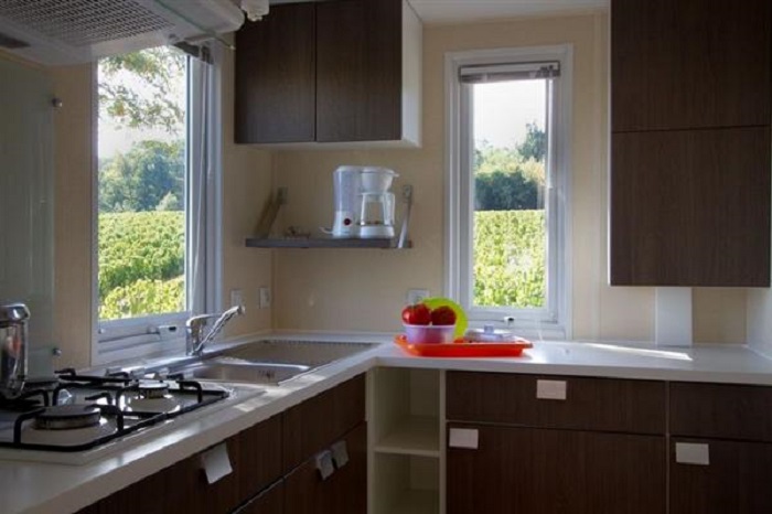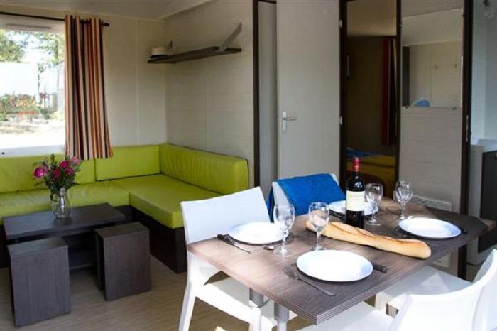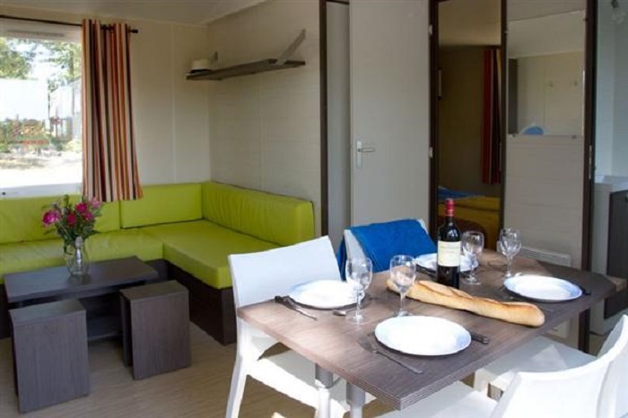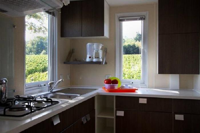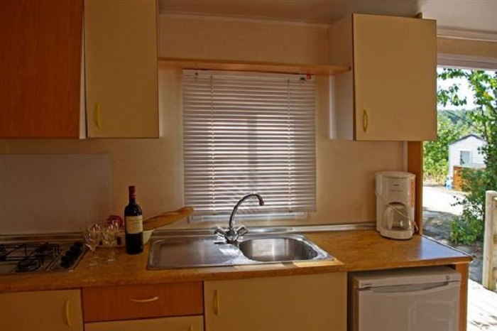Le mobil home dispose d'une cuisine équipée avec réfrigérateur, plaque de cuisson 4 feux gaz, cafetière électrique et kit vaisselle pour 6 personnes. Terrasse équipée d’un mobilier de jardin pour 6 personnes et parasol. Chauffage électrique.