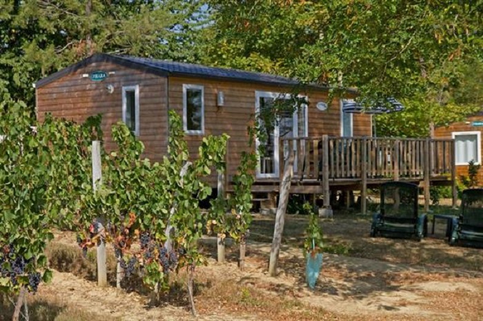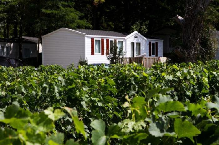 Mobil Home Prestige 3 Pièces 4/6 personnes de 33m², niché dans les vignes, composé d'un séjour-salon avec banquette lit double et coin cuisine équipé, d'une chambre avec un lit double, d'une chambre avec 2 lits simples, d'une salle de bain avec cabine de douche et meuble lavabo, d'un WC indépendant et d'une terrasse en bois de 15.6m².