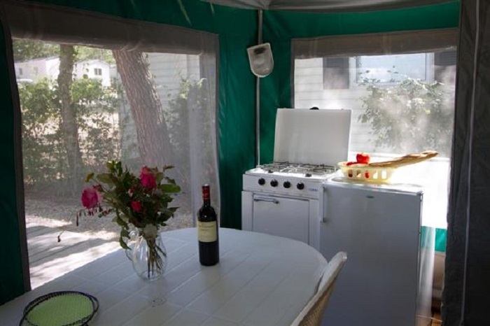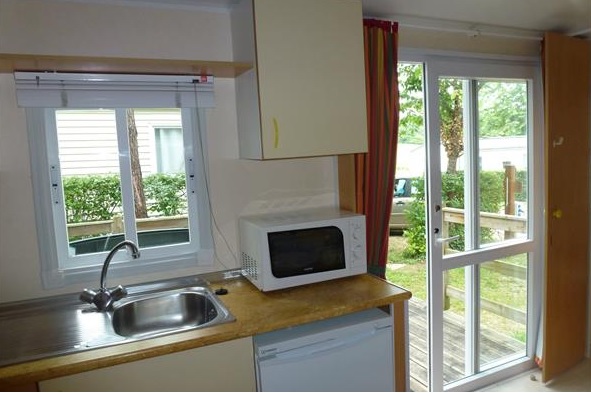 Le mobil home dispose d'une cuisine équipée avec réfrigérateur, micro-ondes, plaque de cuisson 4 feux gaz, cafetière électrique et kit vaisselle pour 6 personnes. Terrasse équipée d’un mobilier de jardin pour 6 personnes et parasol.