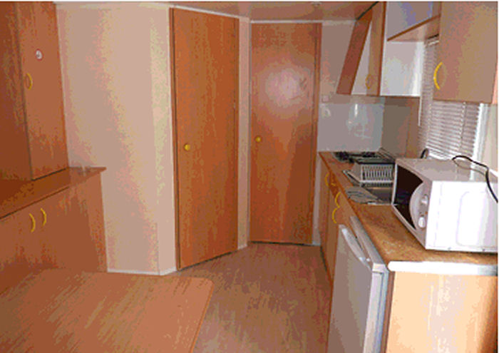 Le mobil home dispose d'une cuisine équipée avec réfrigérateur, micro-ondes, plaque de cuisson 4 feux gaz, cafetière électrique et kit vaisselle pour 6 personnes. Terrasse équipée d?un mobilier de jardin pour 6 personnes et parasol.