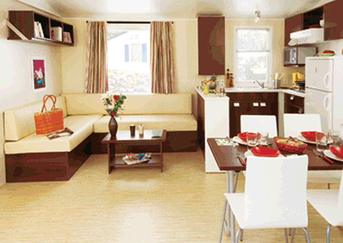 Mobil Home 4/6 personnes de 27m² composé d'un séjour-salon avec banquette lit double et coin cuisine équipé, d'une chambre avec un lit double, d'une chambre avec 2 lits simples, d'une salle de bain avec cabine de douche et meuble lavabo, d'un WC indépendant et d'une terrasse en bois de 10m².