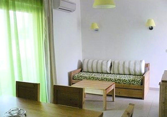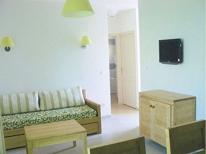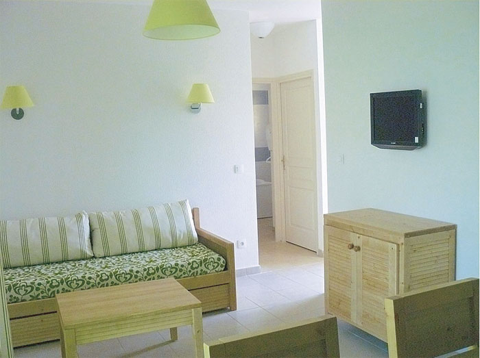 Appartement de 46 à 48m² de 3 pièces pour 6 personnes composé d'un séjour avec canapé lit gigogne pour 2 personnes, d'une chambre avec lit double, d'une chambre avec 2 lits simples, d'une kitchenette équipée, d'une salle de bains ou douche avec WC séparés pour certains. Certains appartements sont équipés pour personnes à mobilité réduite.