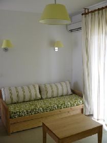 Superficie d'environ 31-34 m². Séjour avec canapé-gigogne. Chambre avec lit double. Cuisine avec lave-vaisselle, micro-ondes, 2 plaques vitrocéramiques, réfrigérateur. Salle de bains avec WC. Terrasse.