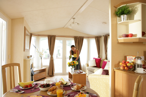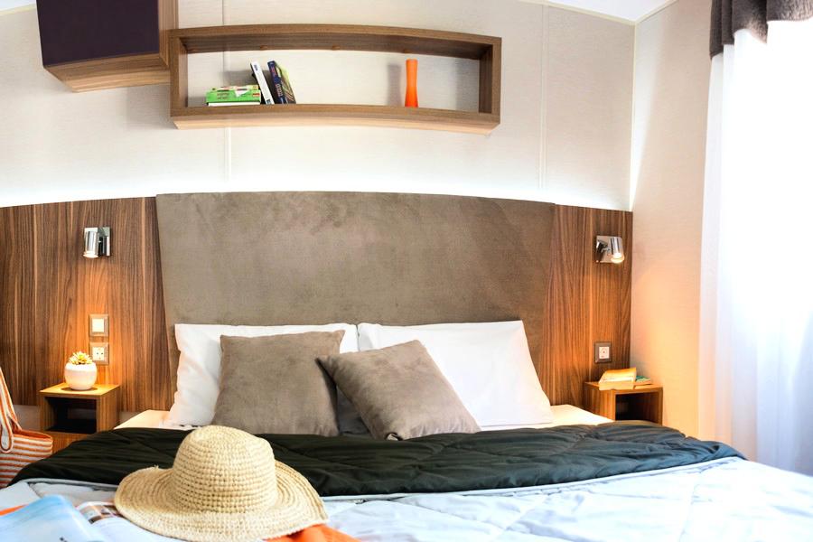 Mobil Home Excellence de 8 personnes de 34 à 40 m² composé de deux chambres avec 2 lits simples côte à côte chacune, une chambre avec un lit double, un salon spacieux avec un large canapé transformable en lit 2 places, une cuisine toute équipée, une salle de bain avec douche, un salon de jardin et parfois un barbecue.