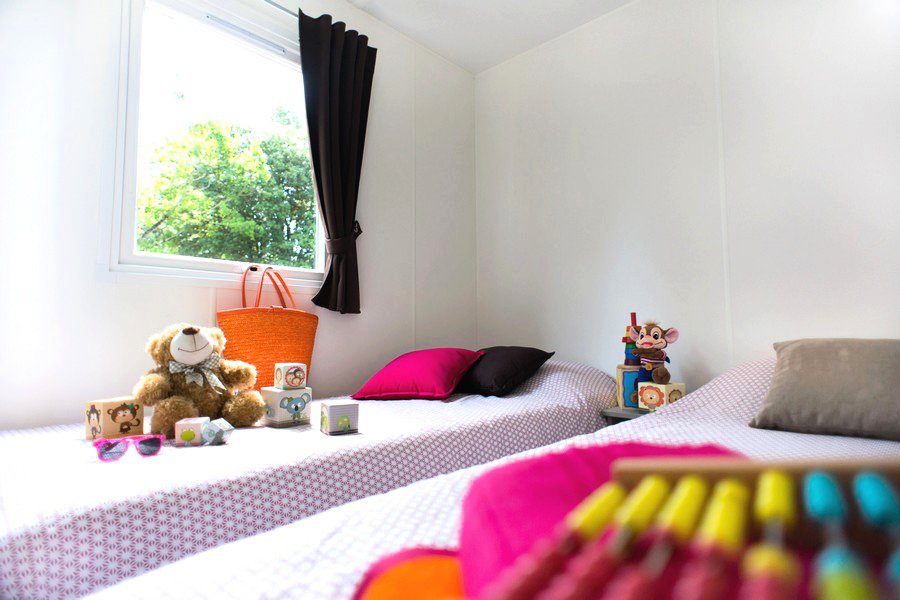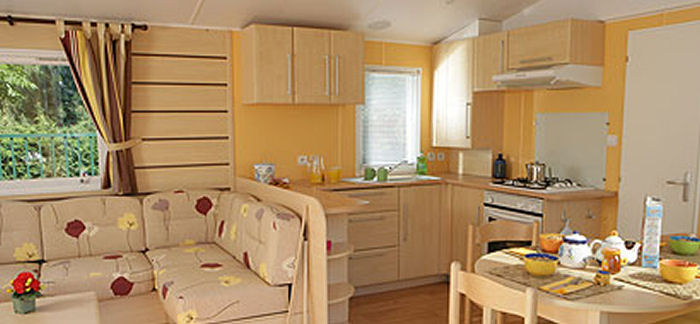 Mobil Home Esprit de 6 personnes de 23 à 27 m² composé d'une chambre avec lits superposés, une chambre avec un lit double, un salon spacieux avec un large canapé transformable en lit 2 places, une cuisine toute équipée, une salle de bain avec douche et mini-baignoire, terrasse avec salon de jardin et parfois un barbecue.