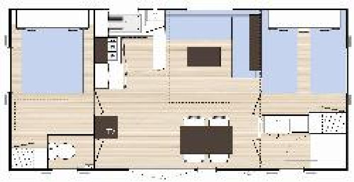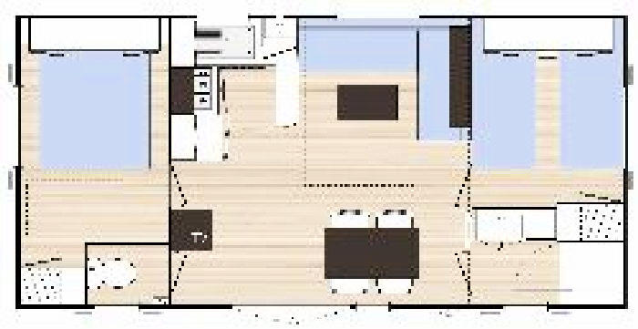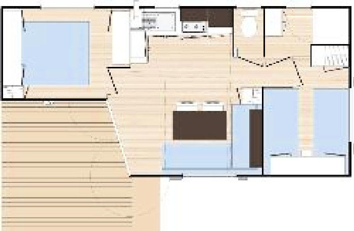 Cottage de 33m² pour 6 personnes, composé d'une kitchenette équipée, d'un séjour avec un coin repas, d'une chambre avec un lit double, de 2 chambres avec 2 lits simples chacune, d'une salle de bains avec une douche, d'un WC séparé et d'une terrasse de 11m².
