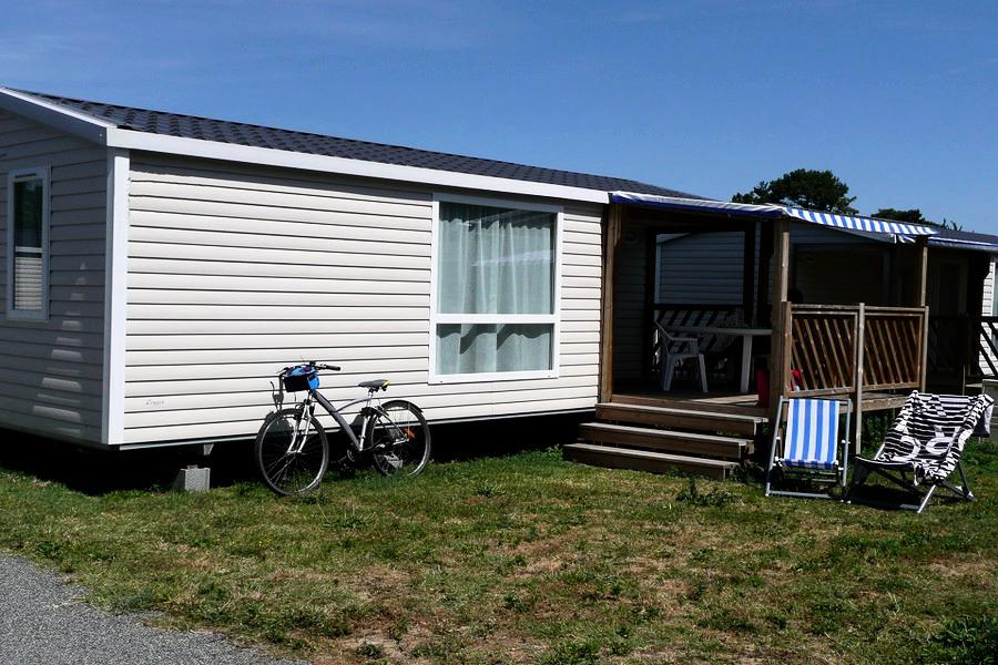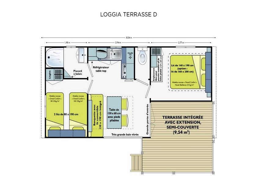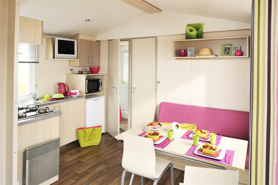 Mobil Home de 25m² environ pour 5/6 personnes, composé d'un séjour avec une banquette convertible en un lit d'une personne (70x190), d'un coin repas, d'une kitchenette équipée, d'une chambre avec un lit double (140x190), d'une seconde chambre avec trois lits simples (70x190) dont un superposé, d'une salle de douche avec WC séparés et d'une terrasse intégrée couverte. Ancienneté: de 2015