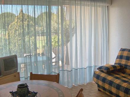 Studio 24 m2, au rez-de-chaussée: séjour/salle à manger avec 1 divan-lit double et TV. Entrée avec 1 x 2 lits superposés. Coin cuisine (4 plaques de cuisson, four). Baignoire sabot, WC séparé. Terrasse 8 m2, situation nord-ouest, jardinet 16 m2. Meubles de terrasse. Place de parking. Maximum 1 animal/ chien autorisé. Depuis le jardinet, accès direct, par 3 marches, aux espaces verts de la résidence.