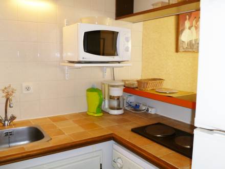 Studio 25 m2 au 1er étage: séjour/salle à manger avec 1 divan-lit double et TV. Entrée avec 1 x 2 lits superposés. Coin cuisine (2 plaques de cuisson, four micro-ondes, congélateur). Salle de bains, WC séparé. Terrasse 7 m2, situation sud-ouest. Meubles de terrasse. Place de parking. Maximum 1 animal/ chien autorisé.