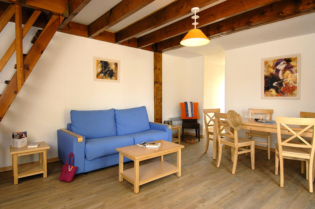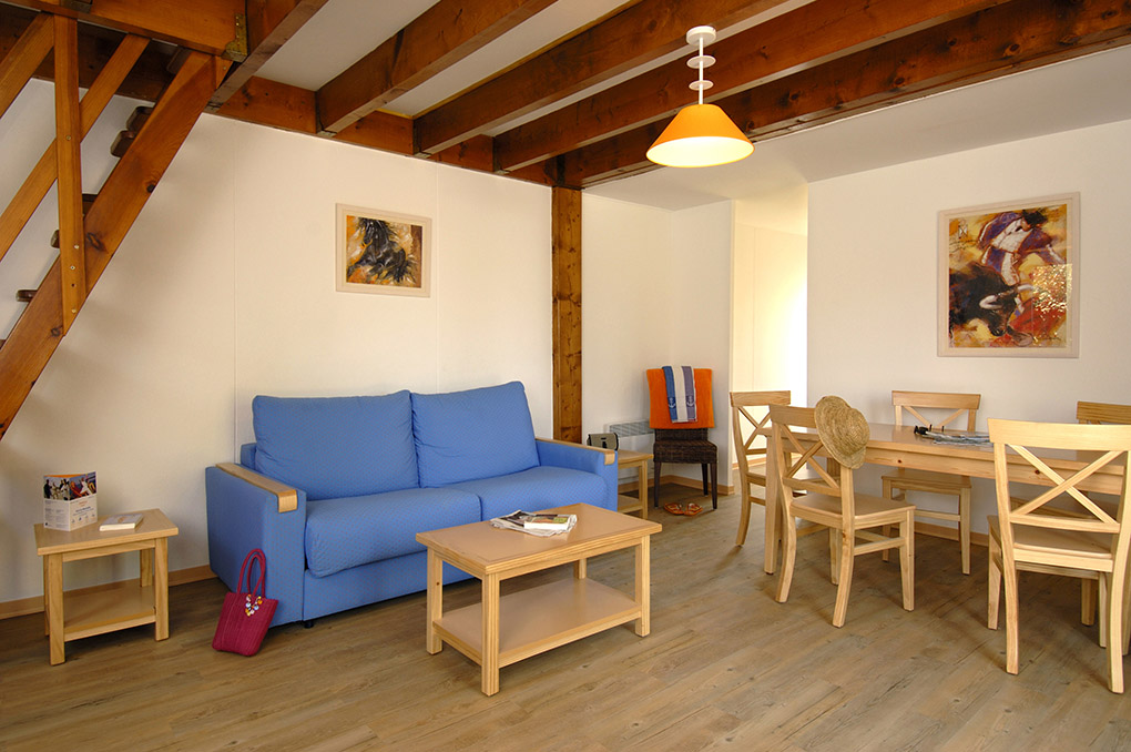 4 Pièces 8 Personnes en duplex de 71m² environ, composée d'une kitchenette aménagée, d'un séjour avec canapé-lit 2 couchages, trois chambres dont 2 à l'étage avec lits simples pour chacune ou parfois un lit double, d'une salle d'eau, de wc séparés et d'une terrasse.