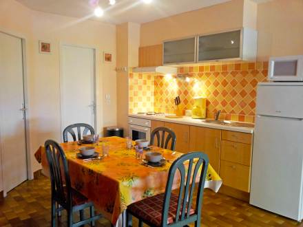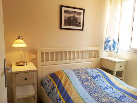 Apt 2 pièces 45 m2 au 1er étage, aménagement fonctionnel et agréable: séjour avec TV (écran plat), DVD. 1 chambre avec 1 grand-lit. Alcôve avec 1 x 2 lits superposés (90 cm). Coin cuisine (4 plaques de cuisson, four, four micro-ondes, congélateur) avec table pour les repas. Douche/WC. A disposition: lave-linge. Place de parking. Maximum 1 animal/ chien autorisé. Le coin séjour est aménagé dans la loggia vitrée, avec vue partielle sur la mer.