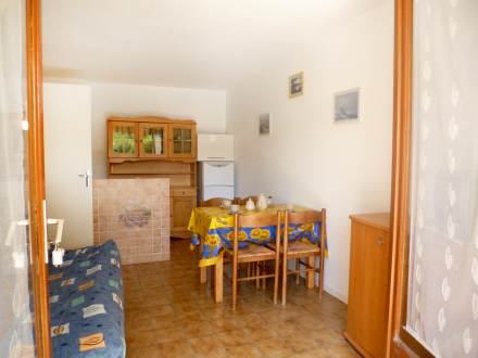 Apt 2 pièces 24 m2, au rez-de-chaussée, situation sud: séjour/salle à manger avec 1 divan-lit double et TV. Sortie sur la terrasse. 1 chambre avec 1 grand-lit. Coin cuisine (2 plaques de cuisson, four, four micro-ondes). Douche/WC. Chauffage électrique. Terrasse 20 m2, situation sud. Meubles de terrasse. A disposition: lave-linge. Veuillez noter: 1 animal domestique toléré maximum 1 animal/ chien autorisé.