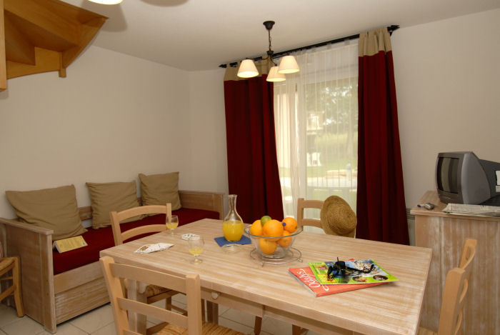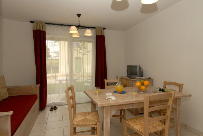 Appartement de 2 pièces pour 4 personnes de 34 à 36m², composé d'un séjour avec un canapé lit-gigogne, d'une chambre avec un lit double, d'une cabine avec deux lits superposés, d'une salle de bains avec toilettes séparés, d'une kitchenette équipée. Rez-de-Jardin avec salon de jardin.