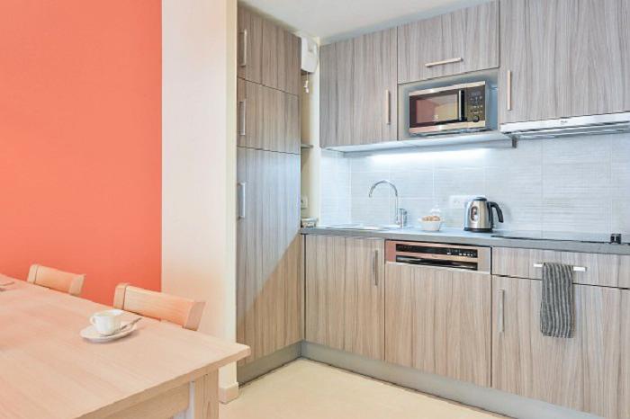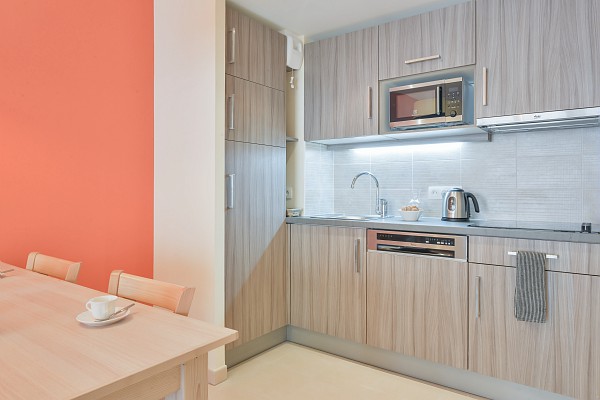 L'appartement possède une cuisine entièrement équipée avec plaques à induction, réfrigérateur, lave-vaisselle, grille pain, hotte, four traditionnel ou four à micro-ondes, ustensiles de cuisine et vaisselle pour 6 personnes.