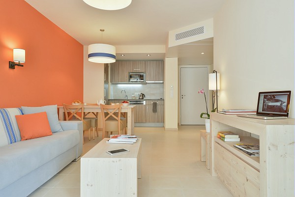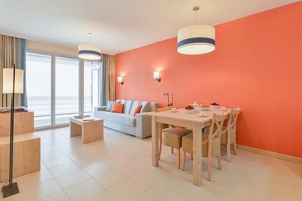 Appartement 2 Pièces 6 Personnes de 51.5m², composé d'un séjour avec cuisine équipée et canapé convertible pour 2 personnes, d'une chambre avec un lit double, une chambre avec 2 lits simples, une salle de bains avec douche à l'italienne et baignoire. Balcon avec mobilier de jardin.