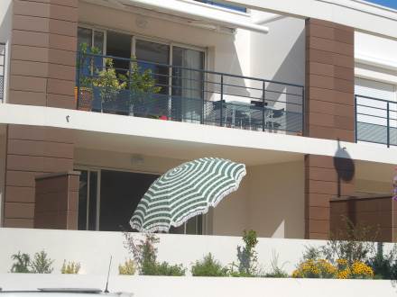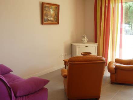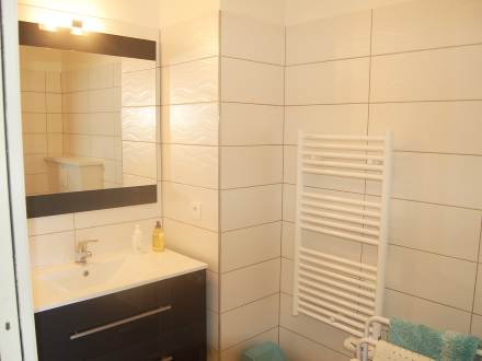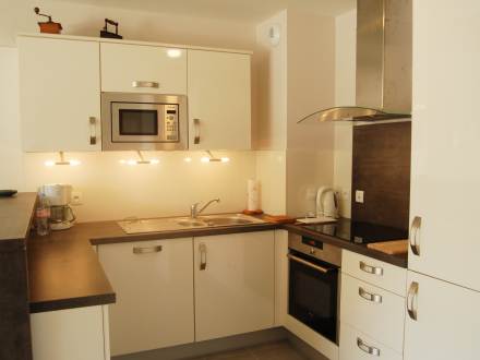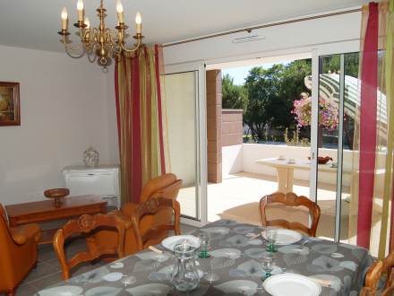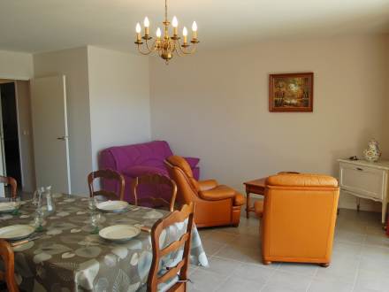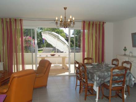 Apt 2 pièces 60 m2, rez-de-chaussée surélevé, situation sud-ouest, spacieux et clair, aménagement fonctionnel: grand séjour/salle à manger avec 1 divan-lit double et TV. Sortie sur la terrasse. 1 chambre avec 1 grand-lit (140 cm). Cuisine ouverte (3 plaques de cuisson, four, lave-vaisselle, four micro-ondes, congélateur, ilot de cuisine). Douche/WC. Chauffage électrique. Grande terrasse 19 m2, situation sud et situation ouest. Meubles de terrasse. A disposition: lave-linge. Garage No 5. Veuillez noter: logement côté rue. Cet appartement est au adapté aux fauteuils roulants , rampes d'acces et portes aux normes.