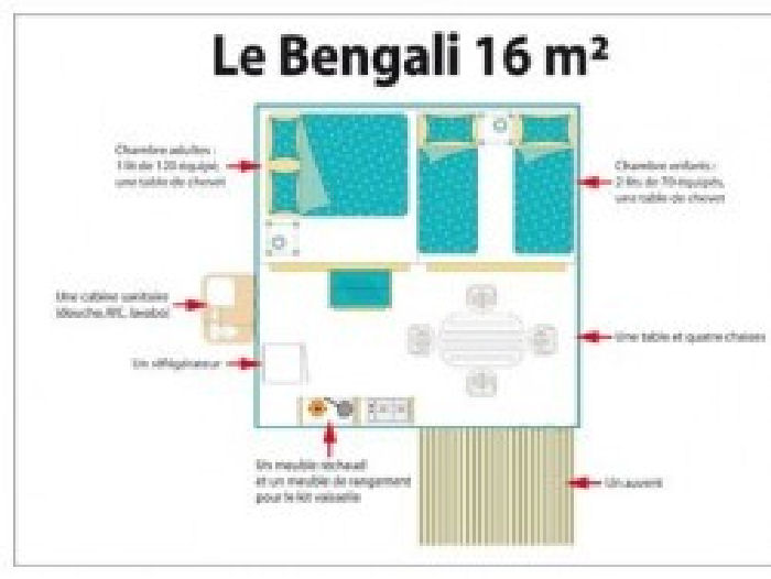 Bungalow toilé de 16m² pouvant accueillir jusqu'à 4 personnes, composé d'un séjour, d'une chambre avec un lit double, d'une chambre avec 2 lits simples, d'un coin cuisine équipé, d'une douche et de toilettes.