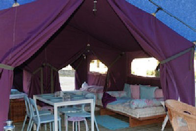 Bungalow toilé de 16m² pouvant accueillir jusqu'à 5 personnes, composé d'un séjour avec couchage pour une personne, d'une chambre avec un lit double, d'une chambre avec 2 lits simples, d'un coin cuisine équipé, d'une douche et de toilettes.