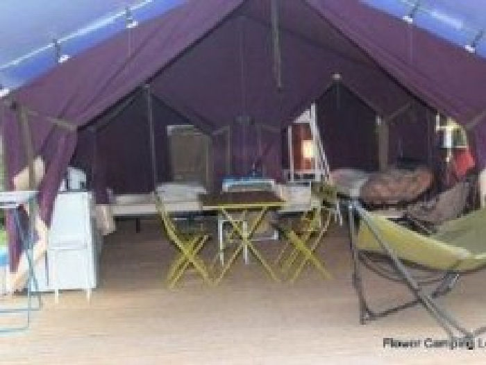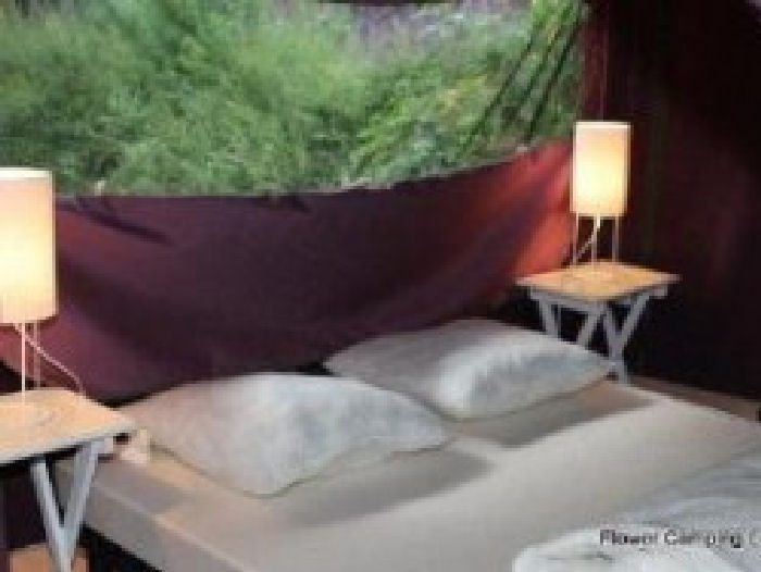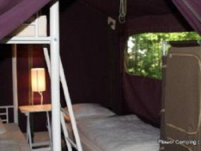 Bungalow toilé Freeflower de 37m² dont 13m² de terrasse couverte, pouvant accueillir jusqu'à 5 personnes, composé d'un séjour avec couchage pour une personne, d'une chambre avec un lit double, d'une chambre avec 2 lits simples, d'un coin cuisine équipé, d'une douche, de toilettes et d'une terrasse couverte.A noter: ce bungalow ne possède pas de sanitaires.