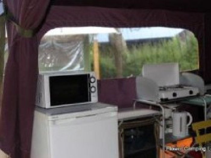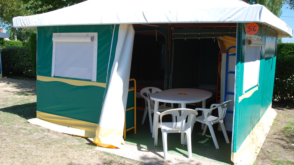 37 m2 de surface 1 Chambre avec 1 Lit double 1 Chambre avec 2 Lit(s) superposé(s) et 1 Lit simple Coin Cuisine Pas de douche et sanitaires dans le logement, utiliser les équipements collectifs Terrasse couverte Plaques gaz Micro-ondes Réfrigérateur Vaisselle et ustensiles de cuisine inclus