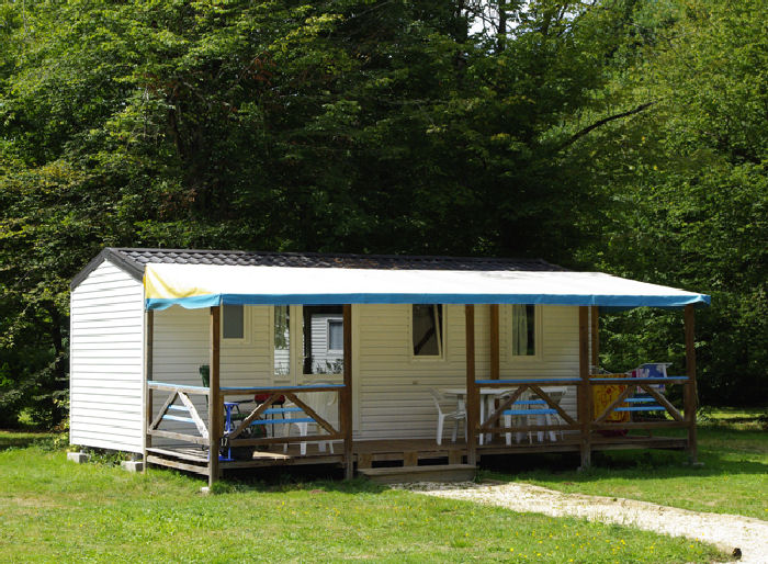 Mobil Home de 27,5m² pouvant accueillir jusqu'à 4/6 personnes, composé d'un séjour avec un canapé lit (2 couchages), d'une chambre avec un lit double, d'une chambres avec 2 lits simples, d'un coin cuisine équipée, d'une salle de bains avec douche, de toilettes et d'une terrasse couverte.