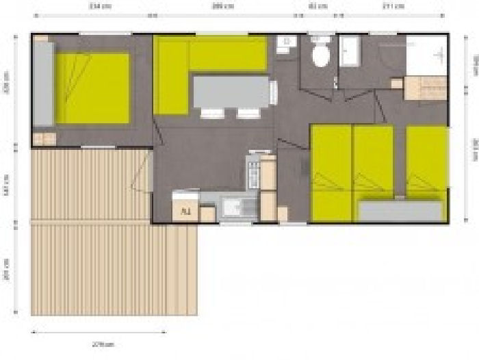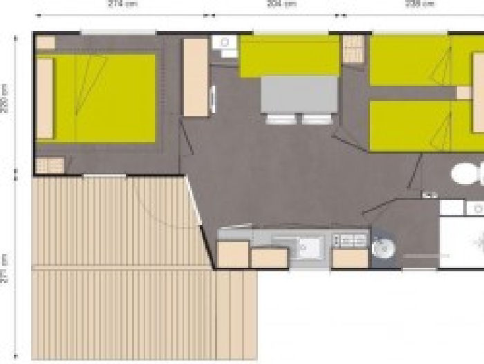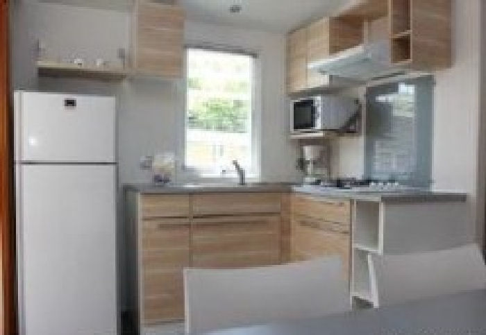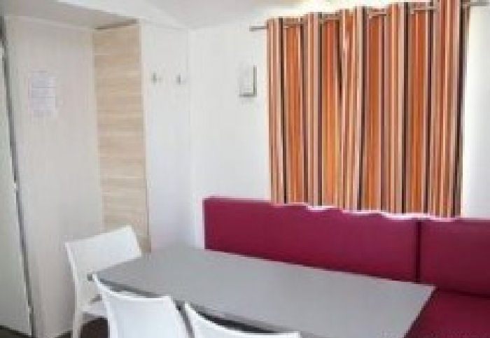 Mobil home de 31m² pour 6/8 personnes, composé d'une kitchenette équipée, d'un séjour avec un coin repas et une banquette convertible en couchage pour 2 personnes, d'une chambre avec un lit double, d'une chambre avec 2 lits simples, d'une chambre avec 2 lits superposés, d'une salle de bains avec une douche, d'un WC séparé et d'une terrasse couverte.