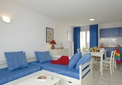 Appartement pour 4 Personnes composé d'un séjour avec deux lits-banquettes et un lit-tiroir, d'une chambre avec un grand lit ou deux lits simples, d'une kitchenette équipée, d'une salle de bains avec WC. Terrasse ou balcon meublé.