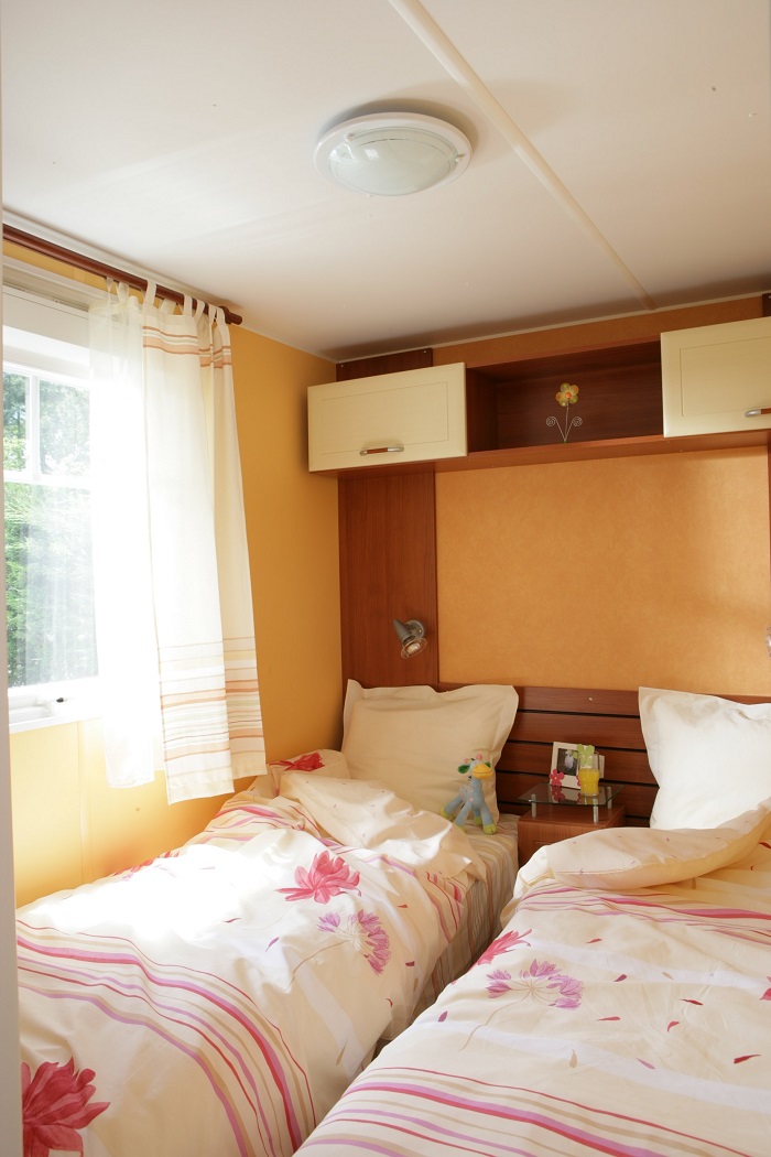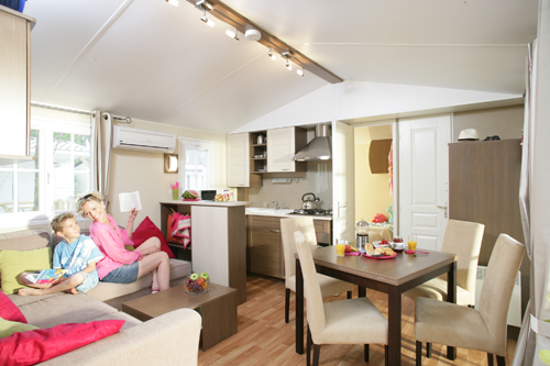 Mobil-home Esprit pour 6 personnes de 23 à 27 m² composé d'une chambre avec 2 lits simples côte à côte, d'une chambre avec un lit double, d'un salon spacieux avec un large canapé transformable en lit 2 places, d'une cuisine toute équipée, d'une salle de bain avec douche. Terrasse avec salon de jardin.
